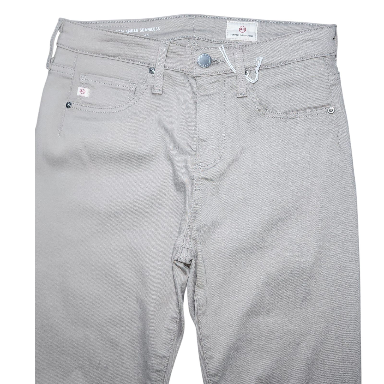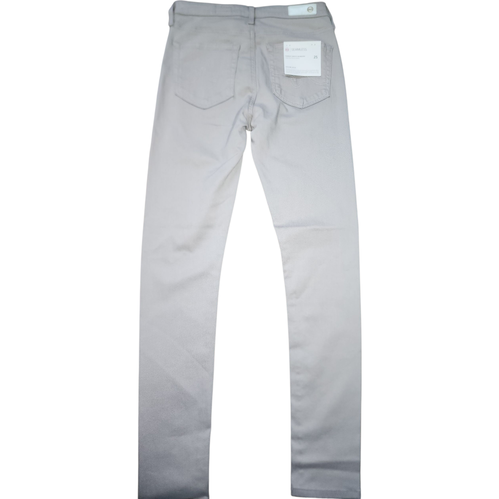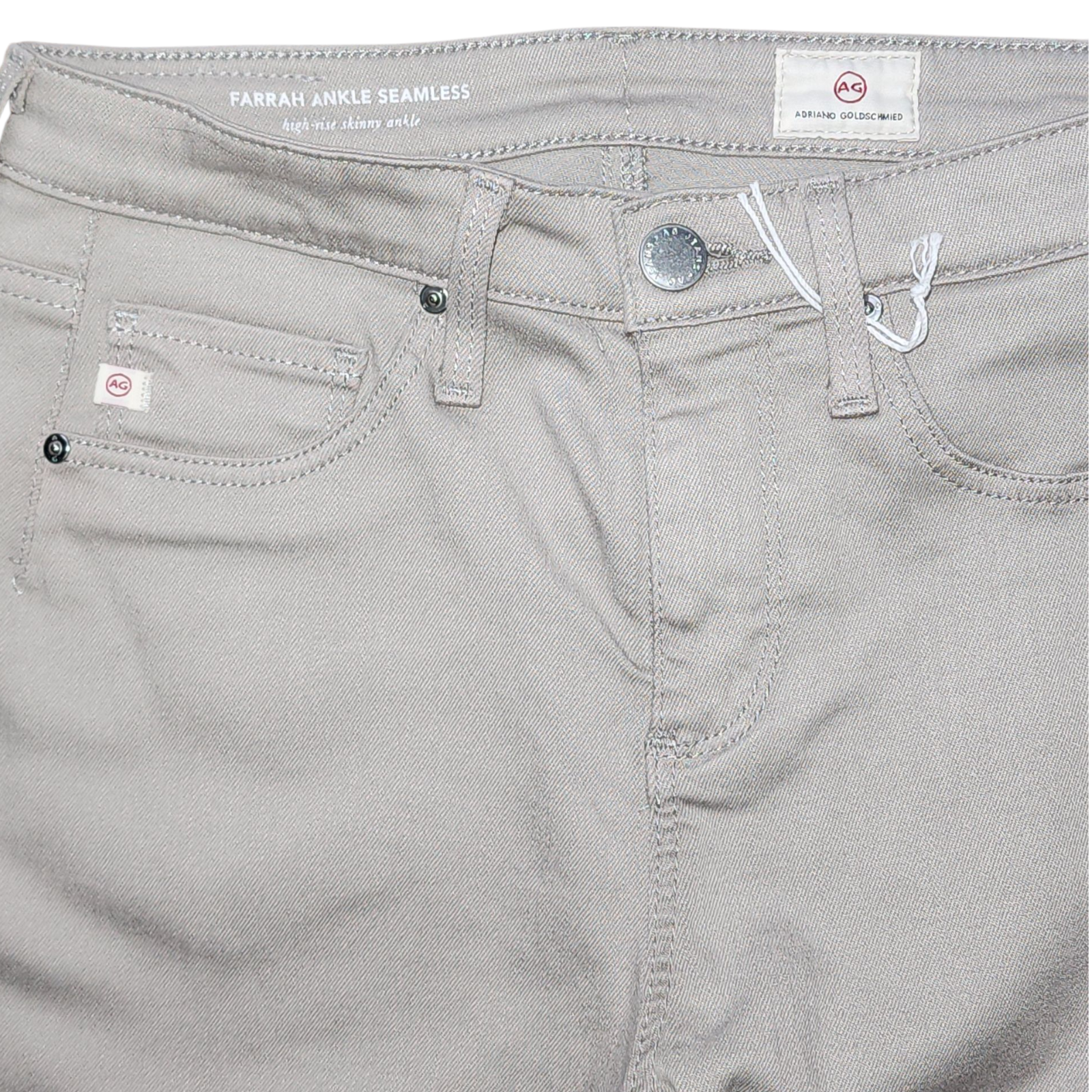 The product is a pair of AG Farrah Ankle Seamless High Rise skinny jeans in size 25 for women, in a stylish light gray color. With a mid-rise waist and a 27-inch inseam, these jeans are made from a comfortable denim fabric with a stretch for added flexibility. Featuring a zip closure, 5-pocket design, and a slim fit, these jeans are perfect for the summer, fall, and spring seasons. Made by AG Adriano Goldschmied, these jeans are machine washable and offer a modern and versatile style for any wardrobe.